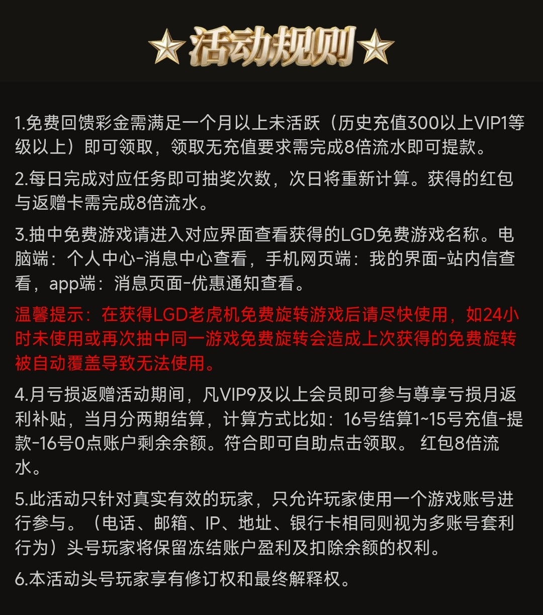 回归彩金需要账号一个月以上未活跃(历史存款300+VIP等级1以上)彩金8倍流水,符合可以上号领取一下彩金