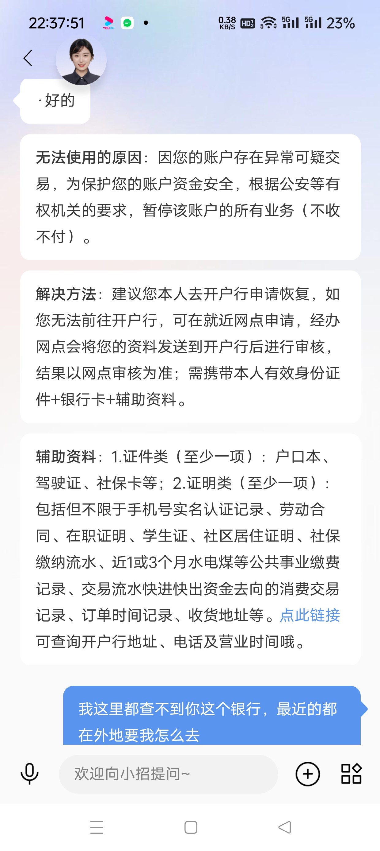 招行的三类电子账户,用了几年吧,旧年被冻了一张,今天又被冻一张,都是流水频繁当天就被冻了,没记住旧年的教训今天这张有1k在里面想留着买币的,结果还是连一天都坚持不了被冻了。我这穷地方也没这个银行,也没打算去外地有办法解冻吗?问这客服他还要你准备一些什么什么证明那我真就解不了了,只希望别的几张卡别被冻吧因为限额都还没存完进支付宝,只有支付宝靠谱不会让你钱用不了最多就是限制收款