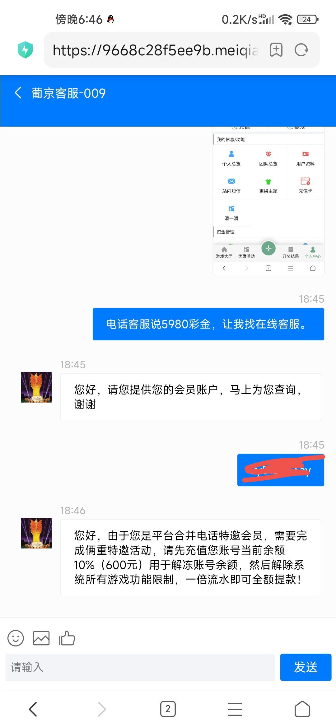 黑台子接电话送5980合并彩金,客服让充值600激活账号一杯流水提现!网站A6113.com!注意避雷!