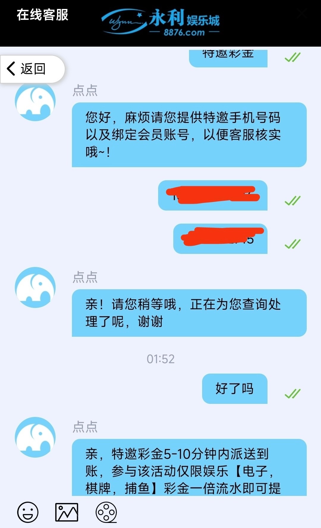 找在线客服发手机号账号碰瓷短信特邀彩金 不需要短信截图