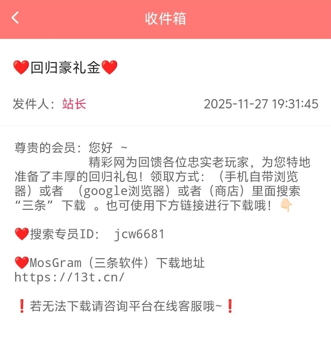 有号的兄弟可以登入上看看站内信有没有收到此邮件,收到了的兄弟需要联系三条软件里的专员领取彩金